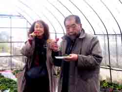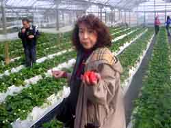イチゴ狩りに行くのには、曜日が大切です。 土曜と日曜は家族連れやツアーで一杯、月曜から水曜までは、未熟なイチゴしか残っていません。緑のイチゴが真っ赤に熟すのには、少なくとも三日は必要です。すなわち、木曜日か金曜日のイチゴ狩りが最高ですね。 同時に、地元の人に案内して貰えれば、結構自由が許されます。 |