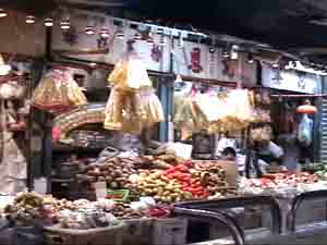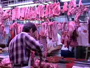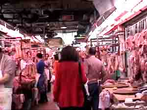 豚肉屋さん、牛肉屋さん、鶏肉屋さん、みんな専門店で、塊をつるし売り、圧巻は豚肉屋さん・・・みんな食べられるんだよ・・・・このビルの4Fに関係者の食堂があって・・・300円程度で腹いっぱいになりそう・・・豚の脚や耳の煮込み、青菜の煮物・・・ゴッタゴッタのおソバ・・・ボクは食べたかったのに・・・(でも、生きている鶏は、ちょっと写せなかったですよ) |