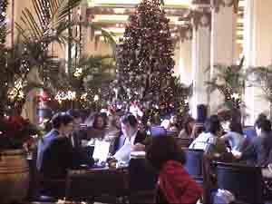| 香港NO1のペニンシュラ・ホテル1Fのティーラウンジ・・・午後になると1時間待ちなので、午前11時にモー人ティーです。アールグレーの紅茶・銀のティーポットにティファニーのティーカップ・・・ブランデー入りのチョコレートケーキ・・・やっぱり最高! (八重子さんはグラスワインですよ・・薄くてカリッとしたポテトチップが美味い) |