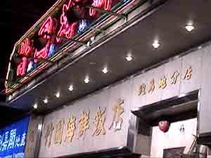 海鮮飯店は入り口の横の水槽で泳いでいる魚や海老ねカニ、アワビなどの食材を選んで料理法を伝えると、お兄さんが網ですくった魚貝の目方を量って調理場に渡します。 |