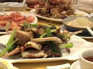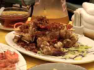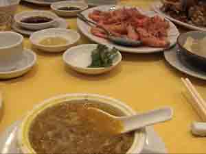 左のカニ肉入りのフカヒレスープは、入り口のマネージャーが「食べなきゃ損だよ」と勧めます。美味しいけれど、全部の料金の半分はこれで消えますから予算にご注意! 右のシャコのにんにく味は忘れられない・・・でっかいシャコがぶつ切りになって、3人でも2匹あれば満足、満足・・ |