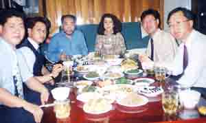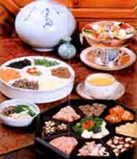 ビールで乾杯して、ナッツ、西瓜、それからは次々に家庭料理が並びます。紅白と草のお餅、のり巻き、キムチ、ナマコ、山菜、牛肉の焼き物、などなど・・・ 何故か、翌日の昼食も韓国家庭料理の店、ちょっとビックリしたのは、取り皿が無いので、ガバガバト突きあうこと、・・・目の前のスープも、先にスプーンを入れられたら、どうしたら良いのか分からなくなってしまいます。 韓国の焼肉も骨付きと言うだけ(一流の店のは美味いらしいが)で、石焼ビビンバも薬膳の黒っぽいご飯で、残りのおこげに水を入れてジュジュジュと食べたのですが、・・・白菜キムチ、大根キムチ、水キムチ、イカキムチと、思いでの味はキムチばかり・・・最高は渡り蟹のキムチ、その名はケイジャン、日本の渡り蟹よりも柔らかく甲羅の殻まで食べられるのですよ。 |