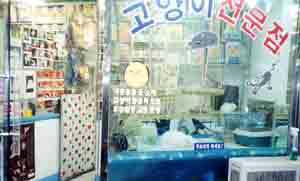 2軒の猫専門店が並んでいました。一方は新しい猫クラブを創立する金さんの店で、アビ、アメショー、ロシアン、ペルシャなどがいましたが、もう一方の店は、毛の長い白い猫(古いタイプのアンゴラ猫のよう)が売られていました。 |