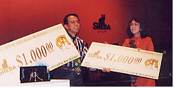 ![]() 上の写真で1人審査員がいないと思ったら、なぜか華やかな場面に必ず登場するのがCFAのマリアカラス(知ってる?)。猫はおすまししているけれど、オーナーは優勝を意識してかシャツの色までバックと一緒。めったに無い満面の笑顔です。 |